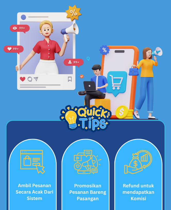 Pengguna cukup mempromosikan pesanan yang diberikan secara acak oleh sistem untuk menghasilkan komisi menarik hingga jutaan rupiah dan event menarik lainnya.